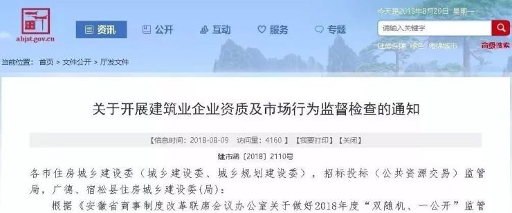 2018年8月8日,安徽省住建厅在《关于开展建筑业企业资质及市场行为监督检查的通知》中明确,自8月中旬开始: